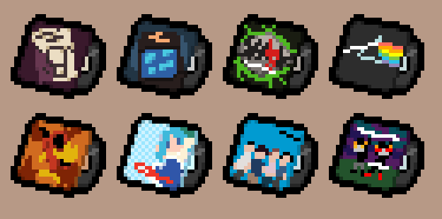 Various albums sprited in the style of Isaac. I imagined that these would be a set similar to that of the book items. I find it fun to try and sprite out something recognizable with relatively low detail. From left to right: