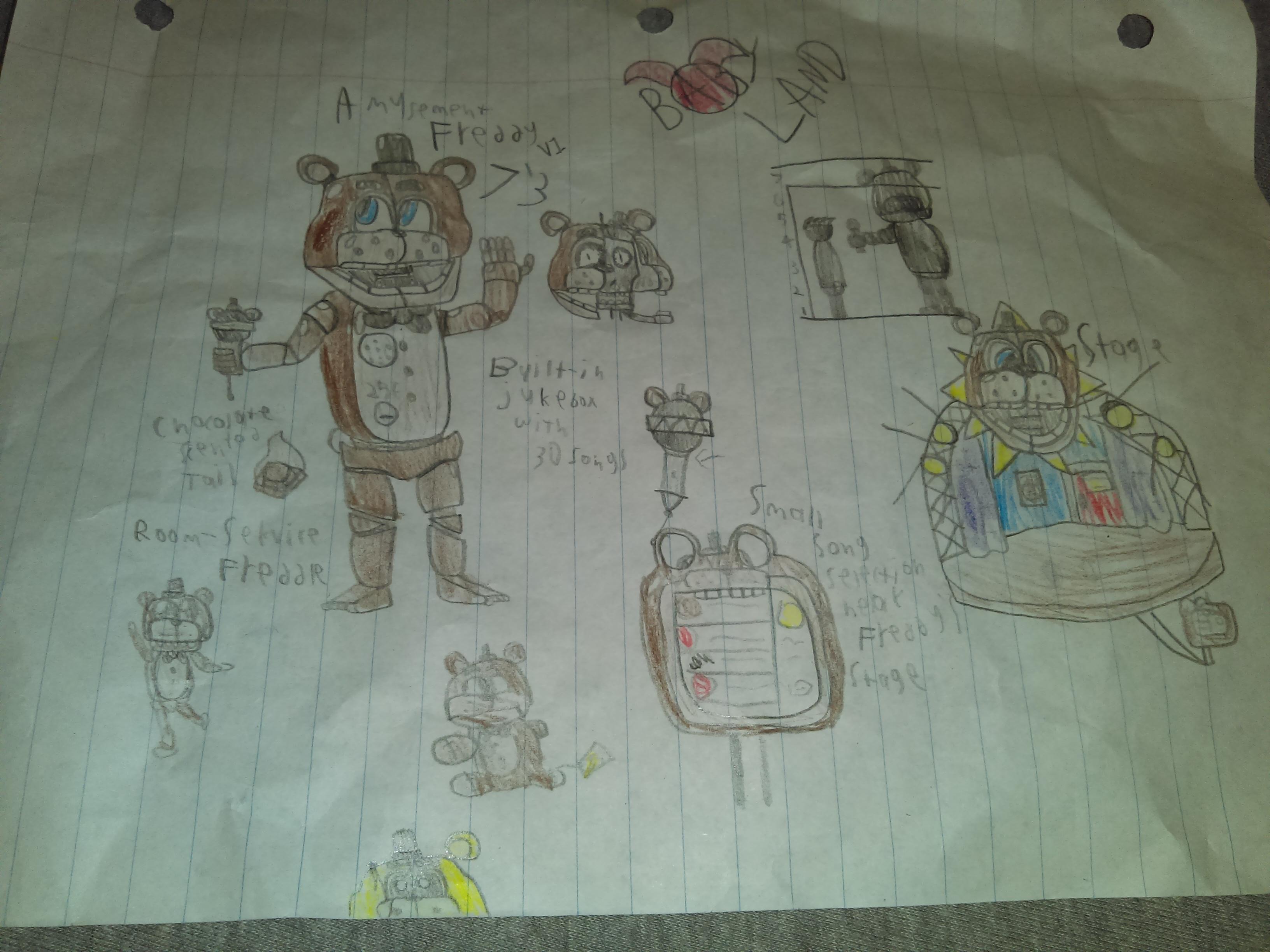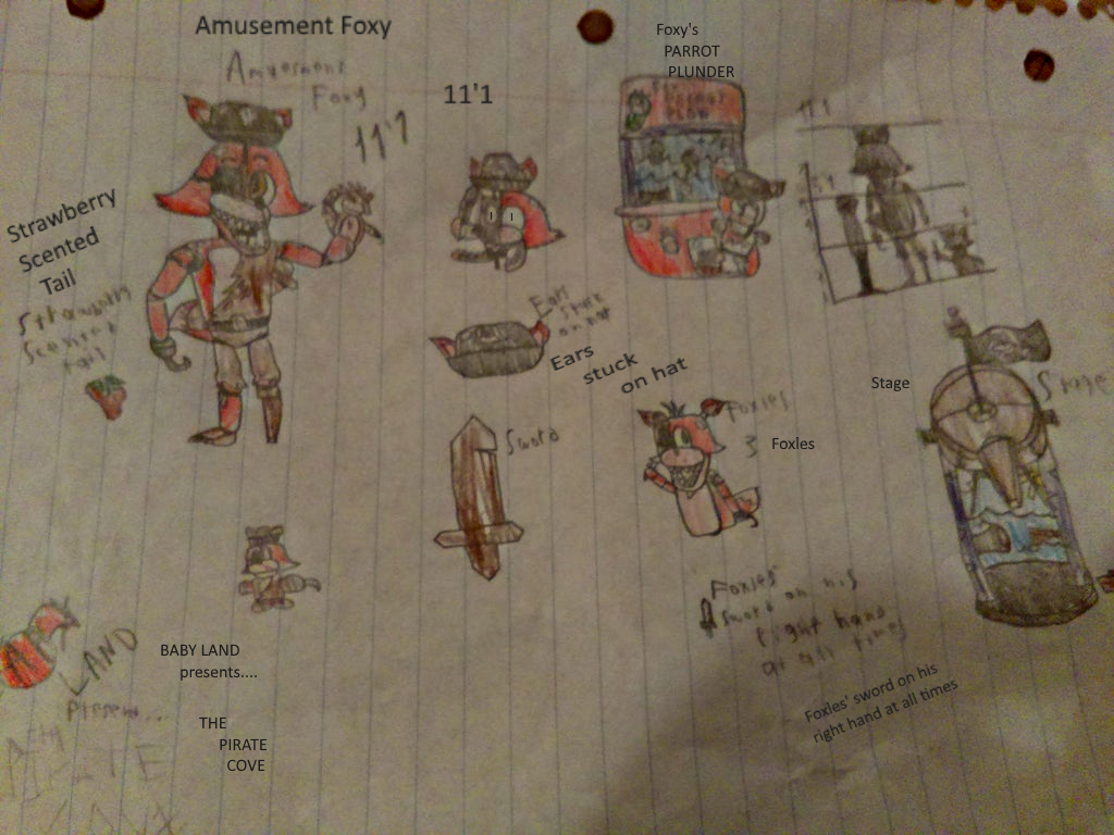The first of various designs for 'Babyland', a hypothetical FNaF fangame set in an amusement park. I tore most of the original drawings up in a fit I had a long time ago, so this is my last chance to archive them. Don't shut this site down, friend!