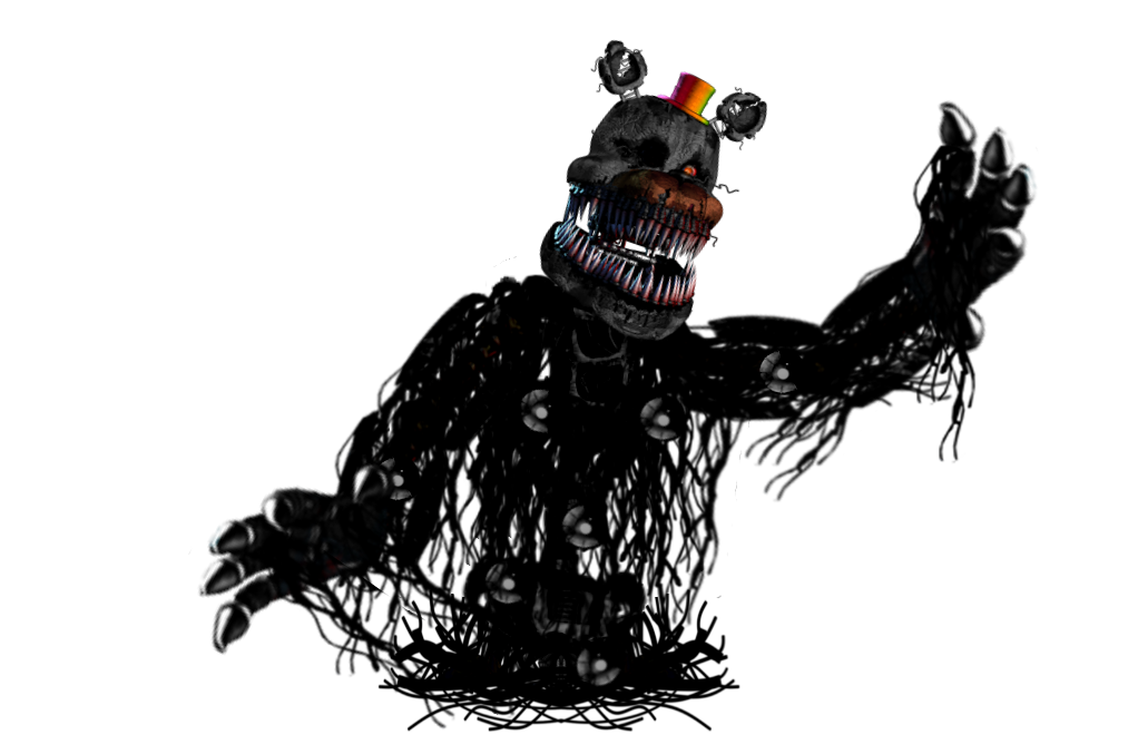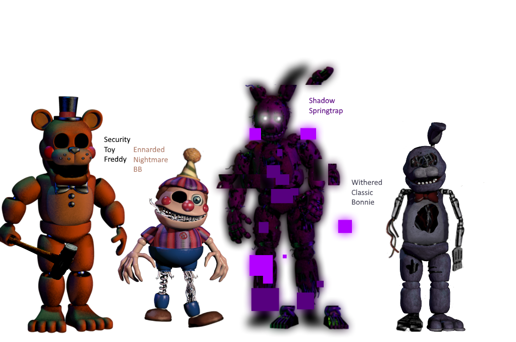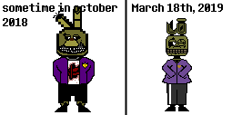 This originally just started as an edit of Bon-Bon to look like Springtrap. When I moved to posting it on Freddit I slightly edited Funtime Freddy to look like Phantom Freddy just to be a bit more in line. If I made this today I think I could've done the Phantom Freddy portion better, but Springtrap looks alright.