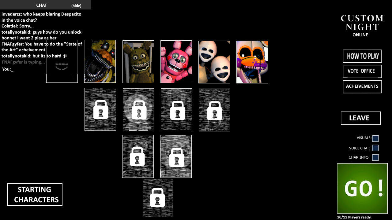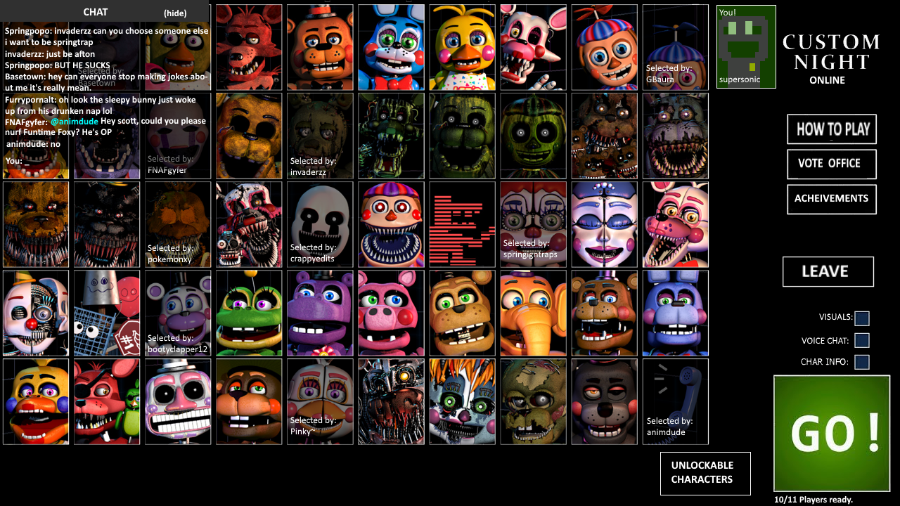 Custom Night roster featuring various Freddit users at the time. I made a complete list of mechanics for them which ended up being kind of backhanded insults i think?? People didn't really like what I gave them idk cant really remember. Thats probably why I never ended up finishing it.