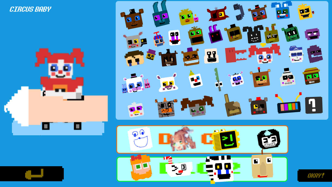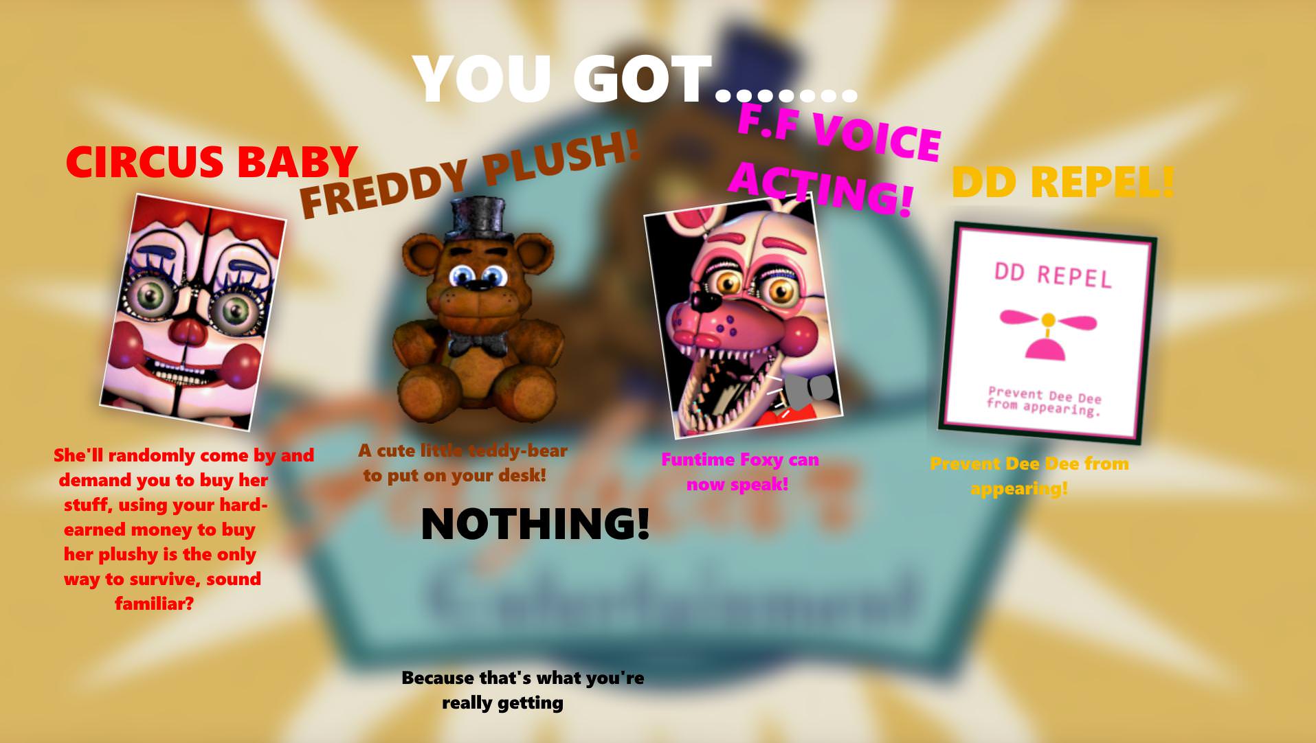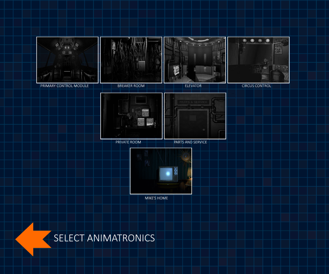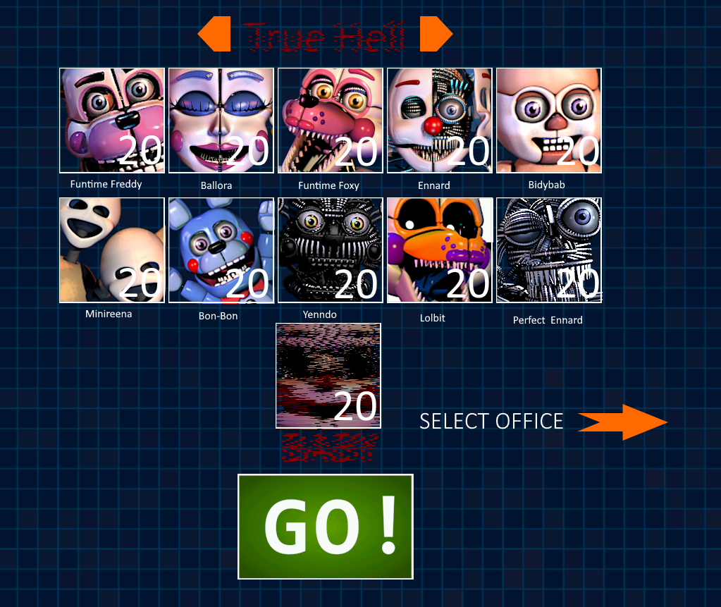 Recreation of what I originall thought Sister Location's custom night could be like. The idea was that you would've chose the location you would've played in, each with their own advantages and disadvantages.