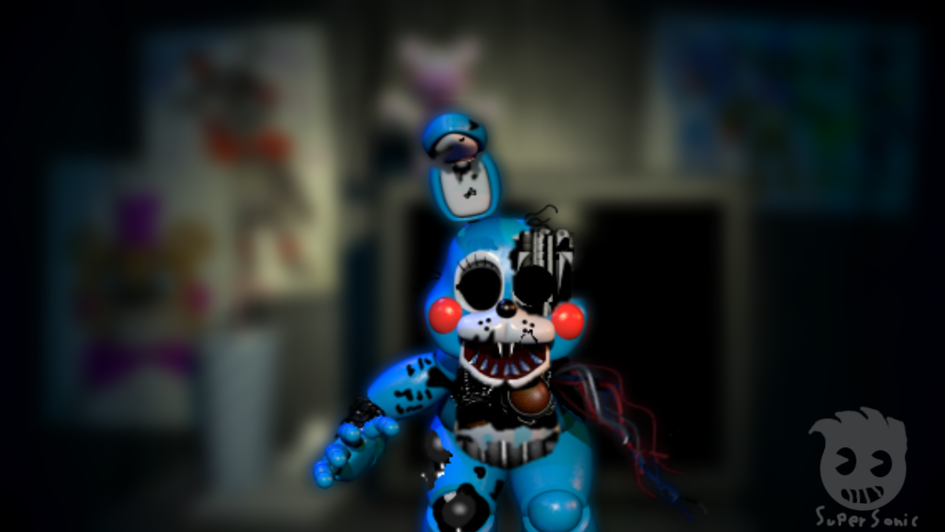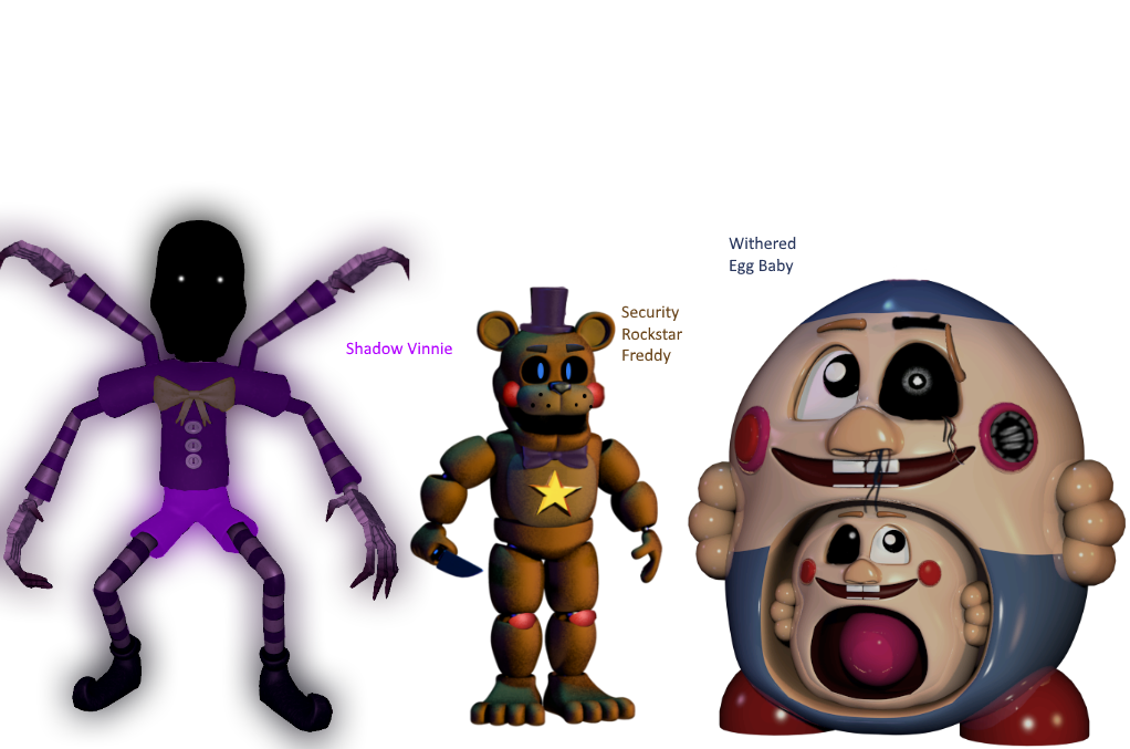 There was a short period of time on Freddit where this site existed that would give you a random animatronic and prefix (i.e Withered Baby, Shadow Chica) and it became a trend to make edits based off them. I hopped on the bandwagon. Security Toy Freddy looks like that cause he was based off some FNaF fangame I forgot the name of. There were these 'security animatronics' in it that wielded fake weapons to scare off intruders or something.