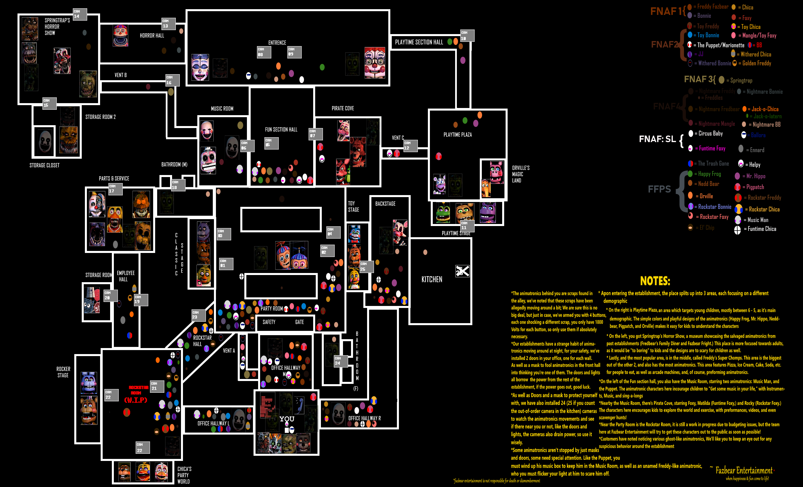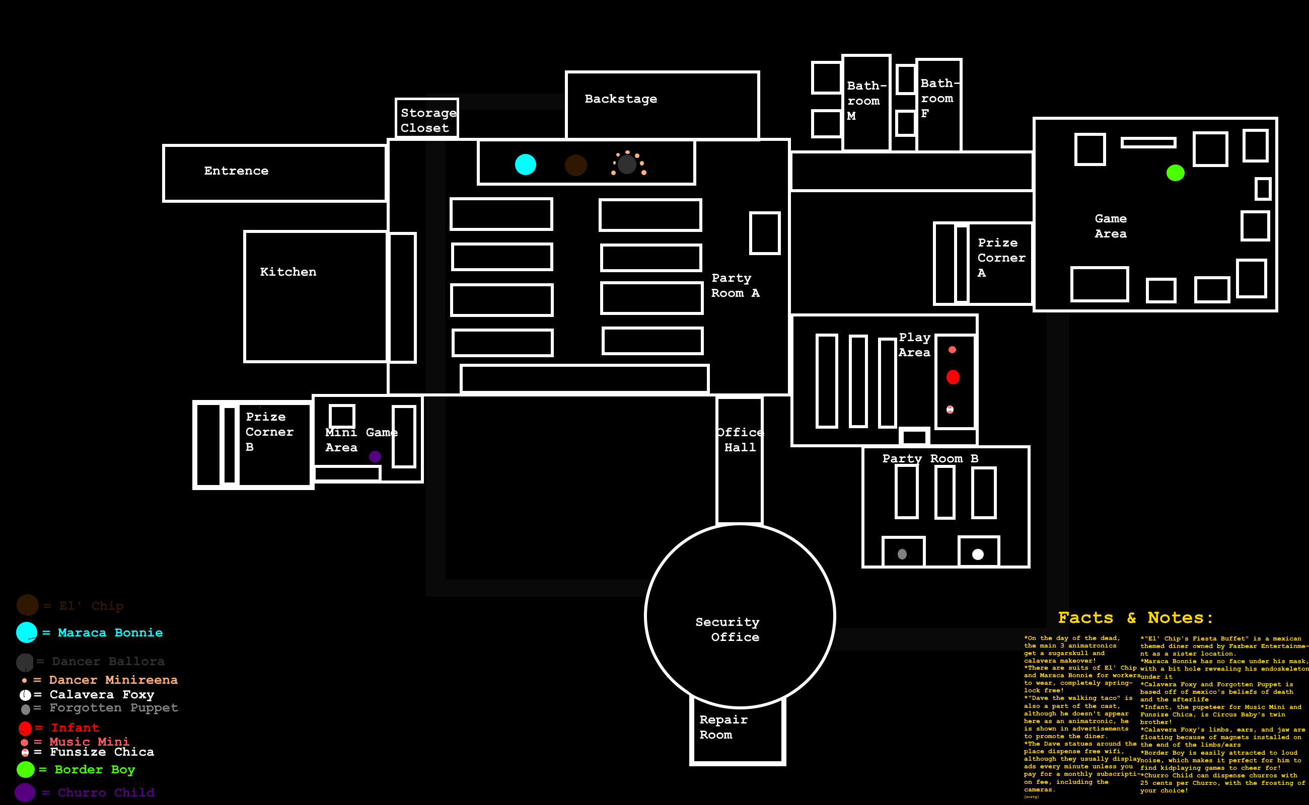 Very complicated speculative map for UCN, prior to its release. The final game ended up reusing the FNaF 1 map. I'm pretty sure this was before the office or the mechanics for the characters were even revealed.